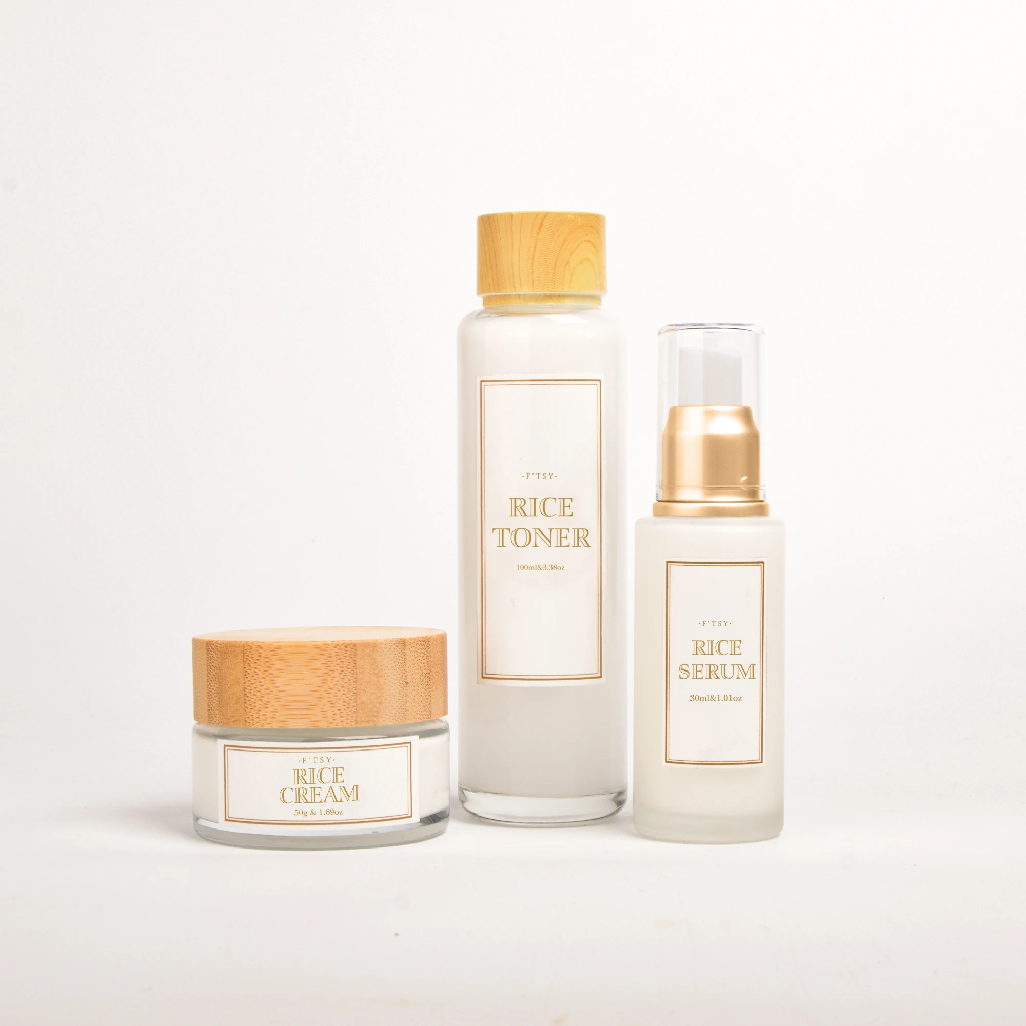 OEM/Private Label Organic Rice Skincare Set for whitening, oil control, and deep hydration. Includes toner, cream, and serum for a radiant, moisturized complexion. Ideal for all skin types. Customize packaging & ingredients!